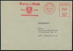 4332 | 10 € | POSTLEITRAUM 7200 (OHNE TUTTLINGEN) : 721 ROTTWEIL/ Europa-Wahl/ 10.6.1979/ Landkreis 1979 (20.3.) AFS Francotyp "Posthorn" (Stadtwappen) Inl.-Bf. (Dü.E-26) | ![]() | |