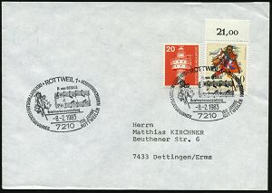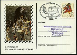 4334 | 12 € | POSTLEITRAUM 7200 (OHNE TUTTLINGEN) : 7210 ROTTWEIL 1/ ..100 JAHRE/ ROTTWEILER NARRENSPRUNG 1983 (8.2.) SSt = Narrensprung (u. 2 Notenzeilen) EF 60 Pf. Narrensprung (Mi.1167 = FDC), Inl.-Sonder-Kt.: Narrensprung (Bo.24) | ![]() | |