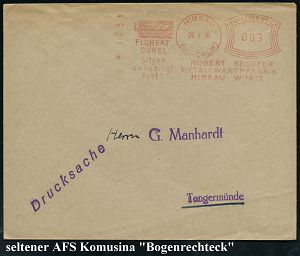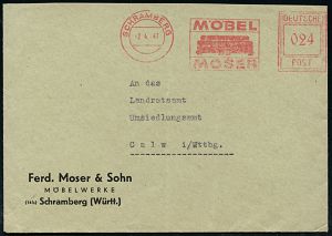 4347 | 15 € | POSTLEITRAUM 7200 (OHNE TUTTLINGEN) : SCHRAMBERG/ MÖBEL/ MOSER 1947 (2.4.) seltener AFS Francotyp "Hochrechteck" (2 gr. Sessel) klar auf (schwach ge-faltetem) Firmen-Bf.: Ferd. Moser & Sohn, MÖBELWERKE (Dü.E-18CEo , nur maximal 1 1/2 Jahre verwendet) | ![]() | |