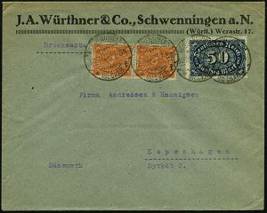 4352 | 18 € | POSTLEITRAUM 7200 (OHNE TUTTLINGEN) : SCHWENNINGEN/ *(NECKAR)/ f 1923 (22.2.) 1K-Brücke mit Monat in Buchstaben "MRZ" statt Ziffer , 2x 5 Mk. Posthorn u. 50 Mk. Ziffer, Firmen-Bf.: J. A. Würtherner & Co.., klar gest. Ausl.-Bf. n. Kopenhagen, rs.AS (Mi.2x 205, 246) | ![]() ![]() | |