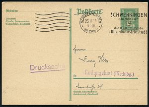 4356 | 18 € | POSTLEITRAUM 7200 (OHNE TUTTLINGEN) : SCHWENNINGEN/ *(NECKAR)*/ die Weltberühmte/ Uhrenindustriestadt 1927 (25.2.) MaWSt (Uhr) + 6 Wellen links klar gest. Inl.-Karte (Bo.4 D, nur 1 1/2 Jahre verwendet) | ![]() | |