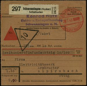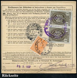 4362 | 25 € | POSTLEITRAUM 7200 (OHNE TUTTLINGEN) : SCHWENNINGEN/ (Neckar)/ Gebühr bezahlt 1937 (20.10.) PFS 1K-Brücke, Wertangabe u. Uhrzeit geblockt + schw. Paketzettel: Schwenningen (Neckar) / S e l b s t b u c h e r + viol. Leit-1L: München 3, Ausl.-Selbstbucher-Paketkarte n. Zagreb, rs. jugoslaw. Tax- u. Fiskalmarken (Dü.A-6, Nr.23) | ![]() ![]() | |