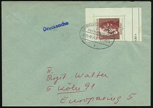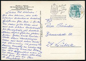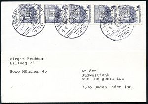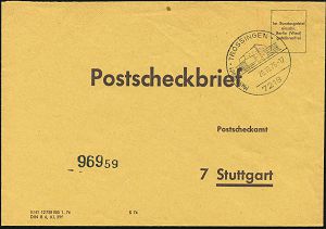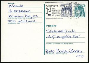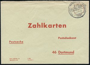 4395 | 16 € | POSTLEITRAUM 7200 (OHNE TUTTLINGEN) : 7218 TROSSINGEN/ Musikstadt 1975 (20.10.) HWSt (Konzerthalle) portofreier, gelber PSch-Bf.!, seltene Verwendung! (Bo.7) | ![]() | |