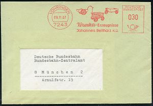 4397 | 15 € | POSTLEITRAUM 7200 (OHNE TUTTLINGEN) : 7243 VÖHRINGEN/ Vorwärts-Erzeugnisse/ Joh.Bellharz KG 1967 (9.11.) dekorativer AFS Francotyp "Posthorn" (div. Handwagen aus Holz) Fern-Bf., seltene Motive! (Dü.E-23) | ![]() | |