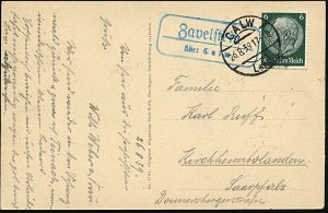 4406 | 15 € | POSTLEITRAUM 7200 (OHNE TUTTLINGEN) : Zavelstein/ über Calw 1939 (26.8.) blauer Ra.2 = PSt.II , Hauspostamt Burgruine Zavelstein + 1K-Brücke: CALW/ L a n d ,klar gest. s/w.-Fern-Ak.: Ruine Zavelstein n. Kirchheimbolanden (Mi.516) | ![]() ![]() | |