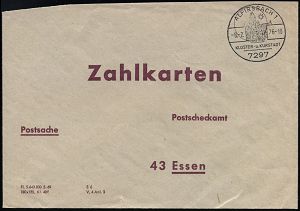4218 | 15 € | POSTLEITRAUM 7200 (OHNE TUTTLINGEN) : 7297 ALPIRSBACH 1/ 1095-1099/ KLOSTER-u.KURSTADT 1976 (8.2.) HWSt = Abtei, Kloster (mit Kirche) portofreier PSch-Innendienstbf.: Zahlkarten.. (braun/grün) für Zahlkartenaustausch!, (kl. Riß) seltene Verwendung! (Bo.5) | ![]() | |