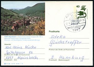 4217 | 14 € | POSTLEITRAUM 7200 (OHNE TUTTLINGEN) : ALPIRSBACH/ ..KLOSTER u.KURSTADT 1963 (26.3.) aptierter HWSt = alte PLGZ entfernt (Ortsbild) klar auf Bedarfs-Kt. mit neuer PLZ im Absender (Bo.4 aptiert) | ![]() | |