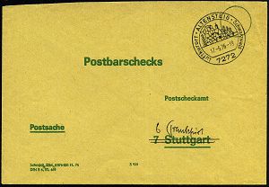 4222 | 16 € | POSTLEITRAUM 7200 (OHNE TUTTLINGEN) : 7272 ALTENSTEIG/ Luftkurort.. 1976 (17.5.) HWSt auf PSch-Innendienst-Bf. (grün/gelb): Postbarschecks, 7 Stuttgart ,hs. geändert in 6 Frankfurt, seltener Dienst-Bf. (Bo.4) | ![]() | |