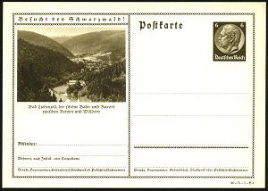 4224 | 12 € | POSTLEITRAUM 7200 (OHNE TUTTLINGEN) : Bad Liebenzell 1936 6 Pf. BiP Hindenbg., braun: Bade- u. Kurort.. , Sonderform: Besucht den Schwarzwald!, ungebr. (Mi.P 236/36-75-B 4) | ![]() | |