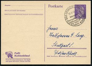 4225 | 15 € | POSTLEITRAUM 7200 (OHNE TUTTLINGEN) : BAD LIEBENZELL (WÜRTT)/ ..Thermalbad/ Luftkurort.. 1943 (21.6.) HWSt (Burgruine) auf Inl.-P 6 Pf. Hitler, viol.: Faßt Kohlenklau! (Mi.P 321/1) Bedarf (Bo.2) | ![]() | |