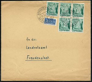 4248 | 25 € | POSTLEITRAUM 7200 (OHNE TUTTLINGEN) : DORNSTETTEN/ a/ (Kr.FREUDENSTADT) 1949 (12.3.) 2K-Steg 2x auf 4er-Block + Einzelstück 8 Pf. Rathaus Waldsee. grün: 5 Stück MeF + 2 Pf. NoB, klar gest. portorichtiger Fern-Bf. (oben kl. unsichtbarer Riß) n. Freudenstadt (Mi.16 MeF + 40.- EUR) | ![]() | |