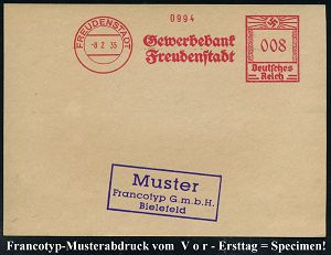 4256 | 35 € | POSTLEITRAUM 7200 (OHNE TUTTLINGEN) : FREUDENSTADT/ Gewerbebank.. 1935 (8.2.) AFS-Musterabdruck Francotyp "Hakenkreuz" , glasklar gest. Francotyp-Musterblatt vom V o r - Ersttag! (mit Attest), selten! (Dü.E-3CEh) | ![]() ![]() | |