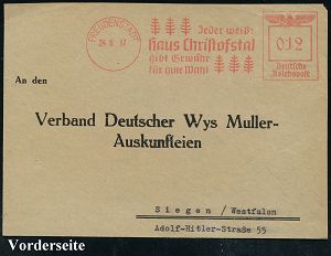 4259 | 22 € | POSTLEITRAUM 7200 (OHNE TUTTLINGEN) : FREUDENSTADT/ Haus Christofstal.. #bzw.# Tuchonkel Christof.. 1937/38 2 verschiedene AFS Francotyp "Reichsaler" (Tannen bzw. Kopfbild mit Bart) je auf Bedarfs-Vorderseite, 2 Belege (Dü.E-5CG) | ![]() ![]() ![]() | |
