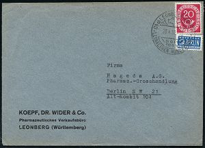 4293 | 15 € | POSTLEITRAUM 7200 (OHNE TUTTLINGEN) : (14a) LEONBERG(WÜRTT)/ seit/ 1846/ LEONBERGER HUNDEZUCHT 1952 (28.4.) HWSt (Leonberger) klar auf 20 Pf. Posthorn, Firmen-Bf.: KOEPF, DR. WIDER & Co.. (Bo.2) | ![]() | |