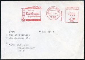 4295 | 8 € | POSTLEITRAUM 7200 (OHNE TUTTLINGEN) : 725 LEOBERG,WÜRTT 1/ GEBÜHR BEZAHLT/ ..Leonberger.. 1969 (2.1.) AFS Francotyp "Posthorn" 000 Pf. = massen-Drs.! (Einfamilienhaus = Bausparkasse) klar gest. Teil-Bf. (Dü.E-26) | ![]() | |