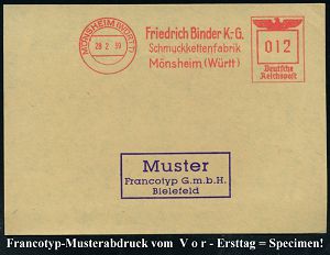 4299 | 35 € | POSTLEITRAUM 7200 (OHNE TUTTLINGEN) : MÖNSHEIM (WÜRTT)/ Friedrich Binder K.-G./ Schmuckkettenfabrik.. 1939 (28.2.) AFS-Musterabdruck Francotyp "Reichsadler" , glasklar gest. Francotyp-Musterblatt vom V o r - Ersttag! (mit Attest), selten! (Dü.E-5CGo) | ![]() ![]() | |