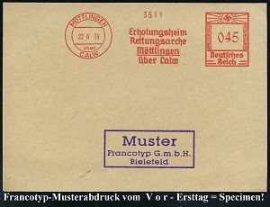 4300 | 35 € | POSTLEITRAUM 7200 (OHNE TUTTLINGEN) : MÖTTLINGEN/ über/ CALW/ Erholungsheim/ Rettungsarche.. 1935 (22.6.) AFS-Musterabdruck Francotyp "Hakenkreuz" = PSt.I-Typ , glasklar gest. Francotyp-Musterblatt vom V o r - Ersttag!, (mit Attest), selten! (Dü.E-2CEh) | ![]() ![]() | |
