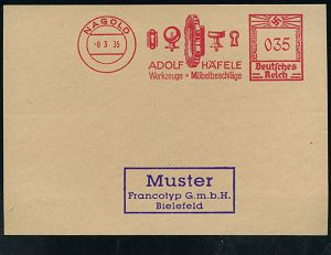 4302 | 35 € | POSTLEITRAUM 7200 (OHNE TUTTLINGEN) : NAGOLD/ ADOLF HÄFELE/ Werkzeuge Möbelbeschläge 1935 (8.3.) AFS-Musterabdruck Francotyp "Hakenkreuz" (div. Beschläge) glasklar gest. Francotyp-Musterblatt vom V o r - Ersttag! (mit Attest), selten! (Dü.E-3CEo) | ![]() ![]() | |