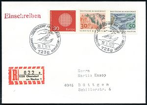 4318 | 18 € | POSTLEITRAUM 7200 (OHNE TUTTLINGEN) : 7238 OBERNHAUSEN AM NECKAR/ EUROP.NATURSCHUTZJAHR 1970 (19.9.) SSt (2 Hände schützen Singvogel) 2x auf Naturschutz 30 u. 50 Pf. (Mi.593/94 u.a.) + RZ: 7238 Oberndorf/am Neckar 1/a (Bf. Eckbugspur) klar gest. Inl.-R-Bf. (Bo.8) | ![]() | |