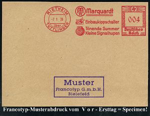 4321 | 35 € | POSTLEITRAUM 7200 (OHNE TUTTLINGEN) : RIETHEIM/ über/ TUTTLINGEN/ Marquardt/ Einbaukippschalter/ Tönende Summer/ Kleine Signalhupen 1936 (7.1.) AFS-Musterabdruck Francotyp "Hakenkreuz" (kippschalter, Klingel) glasklar gest. Francotyp-Musterblatt vom V o r - Ersttag! (mit Attest), selten! (Dü.E-3CEo) | ![]() ![]() | |