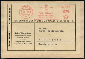 4327 | 16 € | POSTLEITRAUM 7200 (OHNE TUTTLINGEN) : (14b) ROTTWEIL/ ..Gute Drucke/ ein-u.mehrfarbik/ Banbolzer & Co.. 1955 (6.4.) AFS Francotyp "Posthorn" 025 Pf. auf Adreßlabel ZEITUNGSBRUCKSACHE.. Südwestdeutsche Monatsschrift für Kultur, Wirtschaft u. Reisen.. - Bad Cannstatt (Dü.E-23CO) | ![]() | |