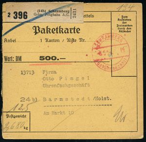 4348 | 18 € | POSTLEITRAUM 7200 (OHNE TUTTLINGEN) : SCHRAMBERG/ Pf./ Gebühr bezahlt 1952 (8.5.) 1K-Brücken-PFS ohne Wertziffer + schw. Selbstbucher-Paketzettel: (14 b) Schramberg/ Gebr. Junghans A.G. (= Uhren-Hersteller), Inl.-Selbstbucher-Wertpaket-Kt. "500.- DM" (n. Barmstedt) | ![]() | |