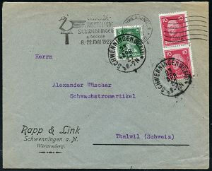 4354 | 28 € | POSTLEITRAUM 7200 (OHNE TUTTLINGEN) : SCHWENNINGEN/ *(NECKAR)*/ GEWERBE-/ AUSSTELLUNG 1927 (23.4.) MWSt + 6 Wellen rechts (stilis. Schwan, Hammer) + 2x 1K: SCHWENNINGEN (NECKAR)/b* zur nachträgl.Entwertung (Mi.387,Paar 390), Ausl.-Bf. in die Schweiz, rs. AS. (Bo.3C) | ![]() ![]() | |