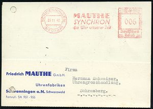 4369 | 16 € | POSTLEITRAUM 7200 (OHNE TUTTLINGEN) : SCHWENNINGEN/ (NECKAR)/ MAUTHE/ SYNCHRON/ d.Uhr unserer Zeit 1940 (23.11.) AFS Francotyp "Hakenkreuz" (Reg. Lochung geschl.) Firmen-Kt.: Friedr. MAUTHE GmbH. Uhrenfabrik (Dü.E-3CEo) | ![]() | |