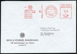 4386 | 15 € | POSTLEITRAUM 7200 (OHNE TUTTLINGEN) : 722 SCHWENNINGEN AM NECKAR 1/ mit IVO/ ZÄHLEN u./ STEUERN/ elektronisch/ elektrisch/ pneuma-tisch.. 1971 (29.7.) AFS Postalia "Posthorn" = Zahlenreihe (+ Pfeile) motivgl. Firmen-Bf.: IRION & VOSSELER ZÄHLERFABRIK (Dü.E-26 B) | ![]() | |