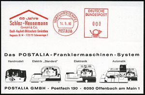 4387 | 16 € | POSTLEITRAUM 7200 (OHNE TUTTLINGEN) : 7730 VS-Schwenningen 1 1980 (14.5.) AFS: VORFÜHRSTEMPEL/POSTALIA/65 Jahre/Schloz-Hennemann/..Blitzschutz.. , seltene Postalia-Muster-Kt. (= Specimen) | ![]() | |
