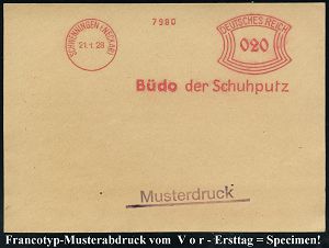 4358 | 35 € | POSTLEITRAUM 7200 (OHNE TUTTLINGEN) : SCHWENNINGEN (NECKAR)/ Büdo der Schujputz 1928 (21.1.) AFS-Musterabdruck Francotyp "Bogenrechteck" , glasklar gest. Francotyp-Musterblatt vom V o r - Ersttag (mit Attest), selten! (Dü.E-1BAh) | ![]() ![]() | |