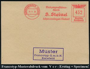4361 | 35 € | POSTLEITRAUM 7200 (OHNE TUTTLINGEN) : SCHWENNINGEN (NECKAR)/ Werkzeugmaschinen-/ Fabrik/ H.Steinel.. 1936 (14.11.) AFS-Musterabdruck Francotyp "Reichsadler" , glasklar gest. Francotyp-Musterblatt vom V o r - Ersttag! (mit Attest), selten! (Dü.E-5CGo) | ![]() ![]() | |