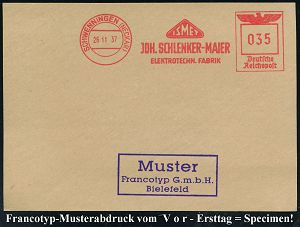 4363 | 35 € | POSTLEITRAUM 7200 (OHNE TUTTLINGEN) : SCHWENNINGEN (NECKAR)/ ISMET/ JOH.SCHLENKER-MAIER/ ELEKTROTECHN.FABRIK 1937 (26.11.) AFS-Musterabdruck Francotyp "Reichsadler" (Monogr.-Logo) glasklar gest. Francotyp-Musterblatt vom V o r - Ersttag ! (mit Attest), selten! (Dü.E-5CGo) | ![]() ![]() | |
