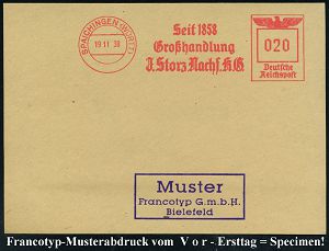 4364 | 35 € | POSTLEITRAUM 7200 (OHNE TUTTLINGEN) : SCHWENNINGEN (NECKAR)/ Seit 1858/ Großhandlung/ J.Storz Nachf, K.G. 1938 (19.11.) AFS-Musterabdruck Francotyp "Reichsadler" , glasklar gest. Francotyp-Musterblatt vom V o r - Ersttag ! (mit Attest), selten! (Dü.E-5CGo) | ![]() ![]() | |