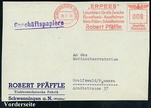 4370 | 18 € | POSTLEITRAUM 7200 (OHNE TUTTLINGEN) : SCHWENNINGEN (NECKAR)/ "ERPEES"/ Leuchten für alle Zwecke/ Rundfunk-Kopfhörer../ Robert Pfäffle 1941 (29.7.) AFS Francotyp "Reichsadler" klar auf Firmen-Vorderseite (Dü.E-5CGo) | ![]() | |