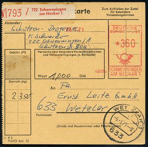 4385 | 18 € | POSTLEITRAUM 7200 (OHNE TUTTLINGEN) : =pa= SCHWENNINGEN/ AM NECKAR 1 1971 (5.1.) Paket-FS Francotyp "Posthorn" *360 (Pf.) + roter Wertpaketzettel: 7222 Schwenningen/am Neckar 1 , klar gest. Inl.-Wertpaket-Kt. n. Wetzlar, vs. AS. (Dü.H-6 D) | ![]() | |