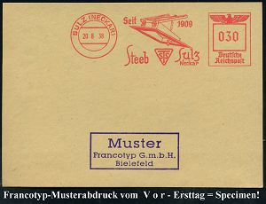 4390 | 35 € | POSTLEITRAUM 7200 (OHNE TUTTLINGEN) : SULZ (NECKAR)/ Seit 1909/ Steeb.. 1938 (20.8.) AFS-Musterabdruck Francotyp "Reichsadler" (Kipp-Fenster) glasklar gest. Francotyp-Musterblatt vom V o r - Ersttag! (m. Attest), selten! (Dü.E-5CGo) | ![]() ![]() | |