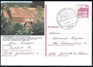 4399 | 14 € | POSTLEITRAUM 7200 (OHNE TUTTLINGEN) : 7244 WALDACHTAL 1/ Luftkurort Lützenhardt.. 1987 (11.12.) HWSt (Ortsbild) auf ortsgl. BiP 60 Pf. Burgen: 7244 Waldachtal.. Die alte Sägemühle (Wassermühle) Inl.-Karte, seltene Kombination! (Mi.P 138) | ![]() | |