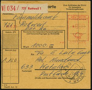 4329 | 25 € | POSTLEITRAUM 7200 (OHNE TUTTLINGEN) : =w= ROTTWEIL 1971 (13.1.) Paket-PFS Francotyp *000 + Wertpaketzettel: V 721 Rottweil 1 + 1K-Segment: 623 WETZLAR 1 (AS) normalerweise "unfrei = 000" bei Wertpaket unzulässig ! (Abs.Fernmeldeamt) sehr seltene Postdienst-Wertpaketkt., daher 000-Stellung!! (Dü.H-6C) | ![]() | |