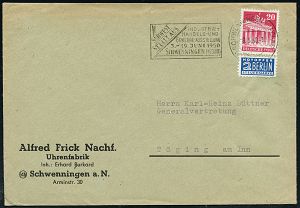 4382 | 14 € | POSTLEITRAUM 7200 (OHNE TUTTLINGEN) : (14b) SCHWENNINGEN (NECKAR)/ SÜDWEST/ STELLT AUS.. 1950 (5.6./9.6.) MWSt u n d SSt je klar auf Firmen-Bf. (Uhrenfabrik A. Frick) bzw. Drs.-Karte, 2 Belege (Bo.11A, 12) | ![]() ![]() | |