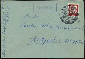 4247 | 10 € | POSTLEITRAUM 7200 (OHNE TUTTLINGEN) : 7241 Dießen 1962 (16.8.) viol. Ra = PSt.II + aptierter HWSt: HORB (NECKAR)/Tor zum Schwarzwald.. = alte PLGZ entfernt (Bf. gering verkürzt) Fern-Bf. (Bo.1, aptiert) | ![]() | |