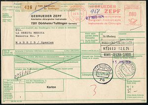 4249 | 20 € | POSTLEITRAUM 7200 (OHNE TUTTLINGEN) : 7201 DÜRBHEIM/ GEBR./ ZEPF/ Chirurgische Instrumente.. 1974 (6.5.) dreisprachiger AFS Francotyp "Posthorn" 880 Pf. + brauner Paketzettel: 7201 Dürbheim/ Kr. Tuttlingen + 1K-Segment: 7201 DÜRBHEIM/a etc. Ausl.-Paket-Kt. (übliche Mittelfalte) n. Spanien sehr seltene Portostufe! (Dü.E-23CO) | ![]() ![]() | |