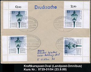 4277 | 14 € | POSTLEITRAUM 7200 (OHNE TUTTLINGEN) : STUTTGART-FREUDENSTADT/ ÜBERLANDPOST/ 0729-01/ 04/ a 1980 (23.9.) Ovalstempel = mobiles Postamt im Überland-Postomnibus, Kurs 04 klar auf Inl.-Bf. | ![]() | |