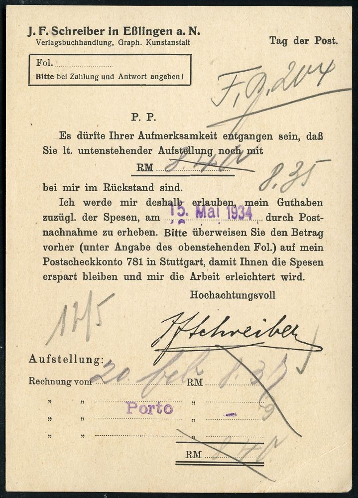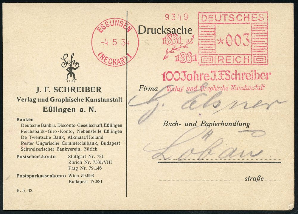 4430 | 22 € | 7300 ESSLINGEN : ESSLINGEN/ (NECKAR)1/ 1831/ 1931/ 100 Jahre J.F.Schreiber/ Verlag u. Graphische Kunstanstalt 1934 (4.5.) Jubil.-AFS Francotyp "Mäanderrechteck" (Lorbeer) auf Firmenkt.: J. F. SCHREIBNER.. (Mahnung) n. Löbau/Sa. (Dü.E-2Ah) | ![]() ![]() | |