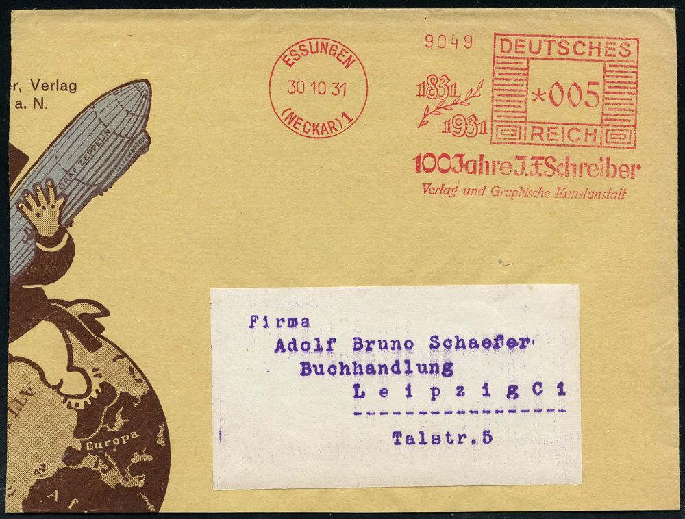 4431 | 20 € | 7300 ESSLINGEN : ESSLINGEN/ (NECKAR)1/ 1831/ 1931/ 100 Jahre J.F.Schreiber/ Verlag u.Graphische Kunstanstalt 1931 (30.10.) Jubil.-AFS Francotyp "Mäanderrechteck" (Lorbeer) auf Teil-Reklame-Bf.: Graf Zeppelin (Dü.E-2Ah) | ![]() | |