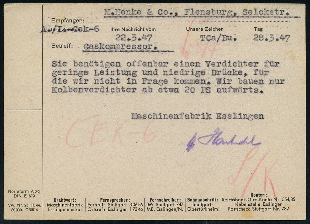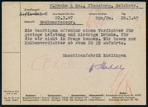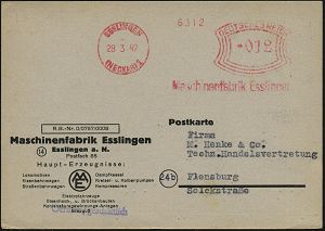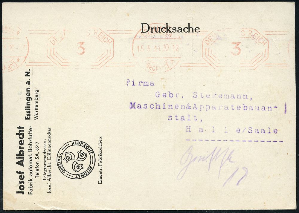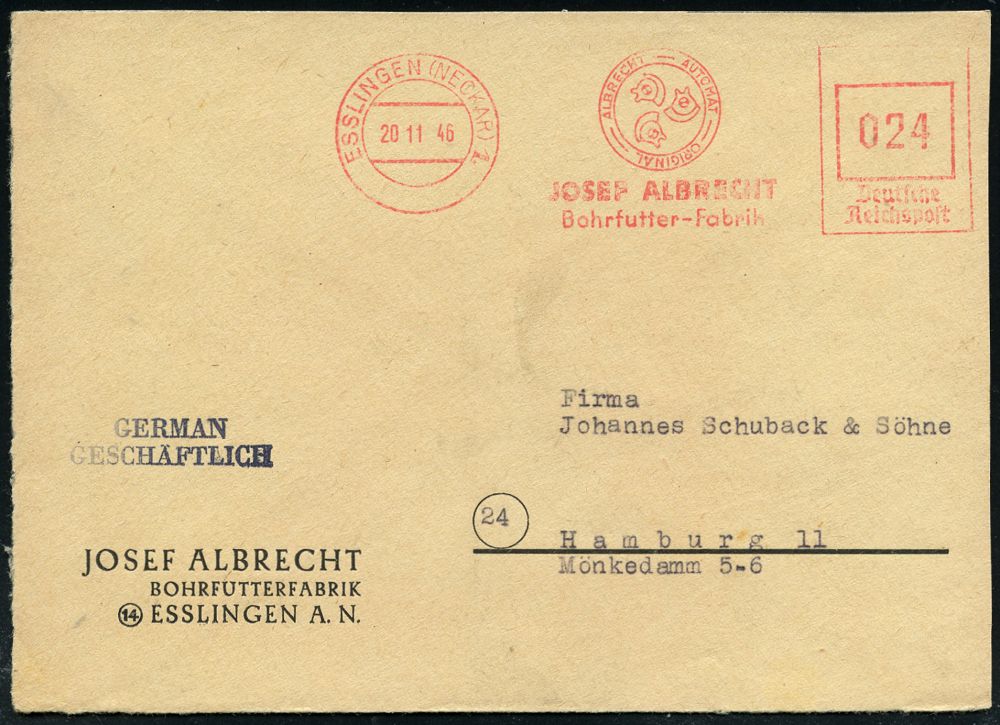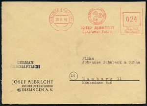 4461 | 25 € | 7300 ESSLINGEN : ESSLINGEN (NECKAR)1/ ALBRECHT AUTOMAT../ JOSEF ALBRECHT/ Bohrfutter-Fabrik 1947 (20.11.) aptierter AFS Francotyp "Reichsadler" = entfernt = Notmaßnahme! (Abb: Bohrfutter) Firmen-Fern-Bf. (Dü.E-13 J-129o) | ![]() | |