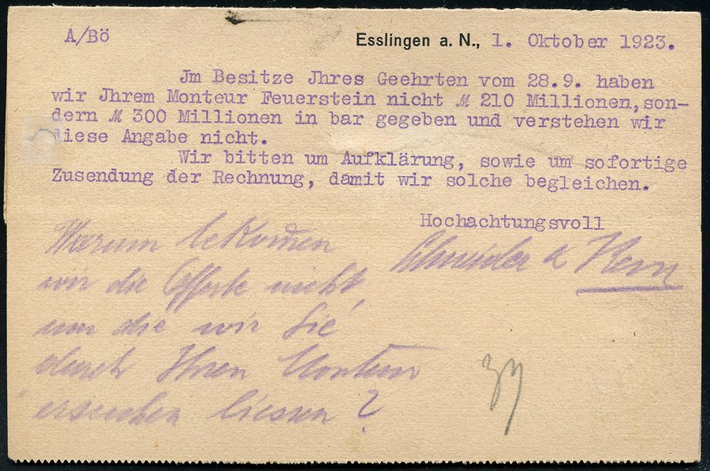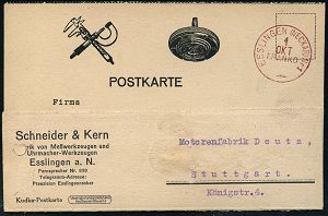 4426 | 30 € | 7300 ESSLINGEN : ESSLINGEN (NECKAR) 1 1923 (1.10.) 1K-PFS ohne Jahr u. Wertangabe = 800.000 Mk. = 1. Tag neuer Tarif! (mit Zierstück) Firmen-Kt.: Schneider & Kern = Fa. für Meß- u. Uhrmacher-Werkzeuge (Meßwerkzeuge, 1x Reg.-Loch geschl.) Hochinfla-Fern-Kt. n. Stuttgart (Dü.A-3) | ![]() ![]() | |
