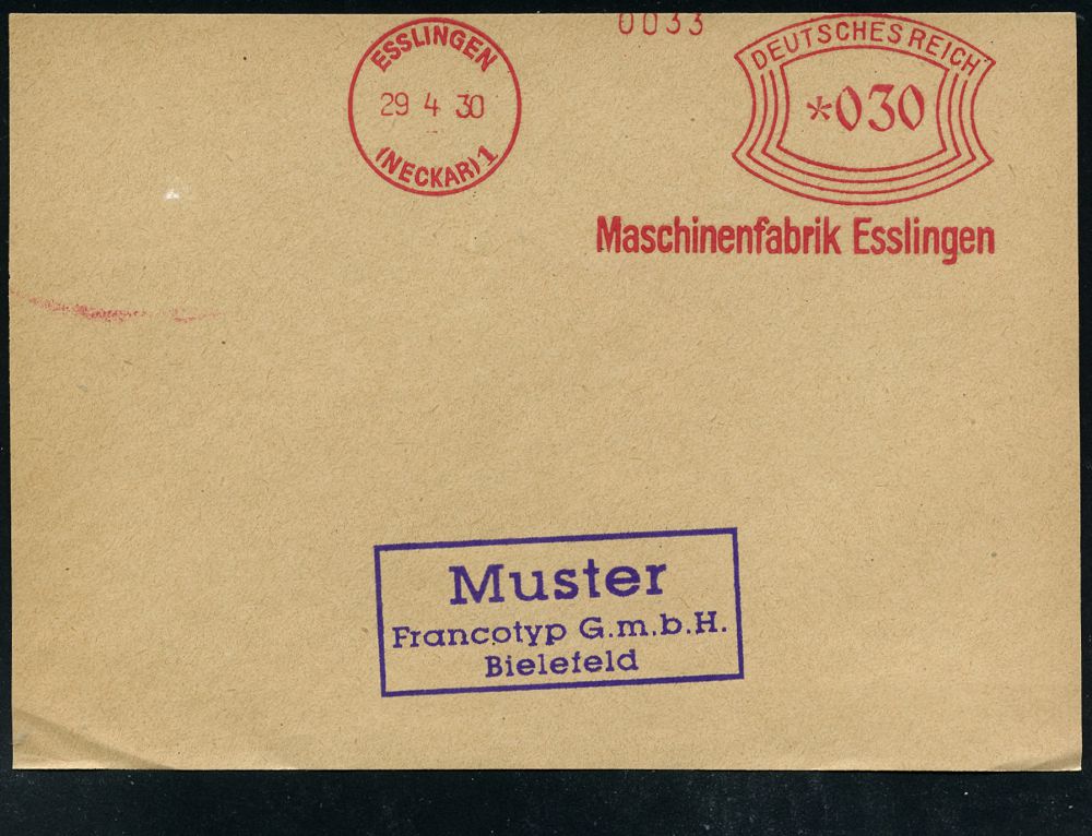 4428 | 35 € | 7300 ESSLINGEN : ESSLINGEN/ (NECKAR)1/ Maschinenfabrik Esslingen 1930 (29.4.) AFS-Musterabdruck Francotyp "Bogenrechteck" = Eisenbahn-Pionier, gegr. 1846, auch Hersteller von Elektro-Mobilen etc.) glasklar gest. Francotyp-Musterblatt vom V o r - Ersttag! (mit Attest), selten! (Dü.E-1Ah) | ![]() ![]() | |