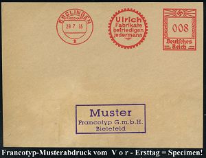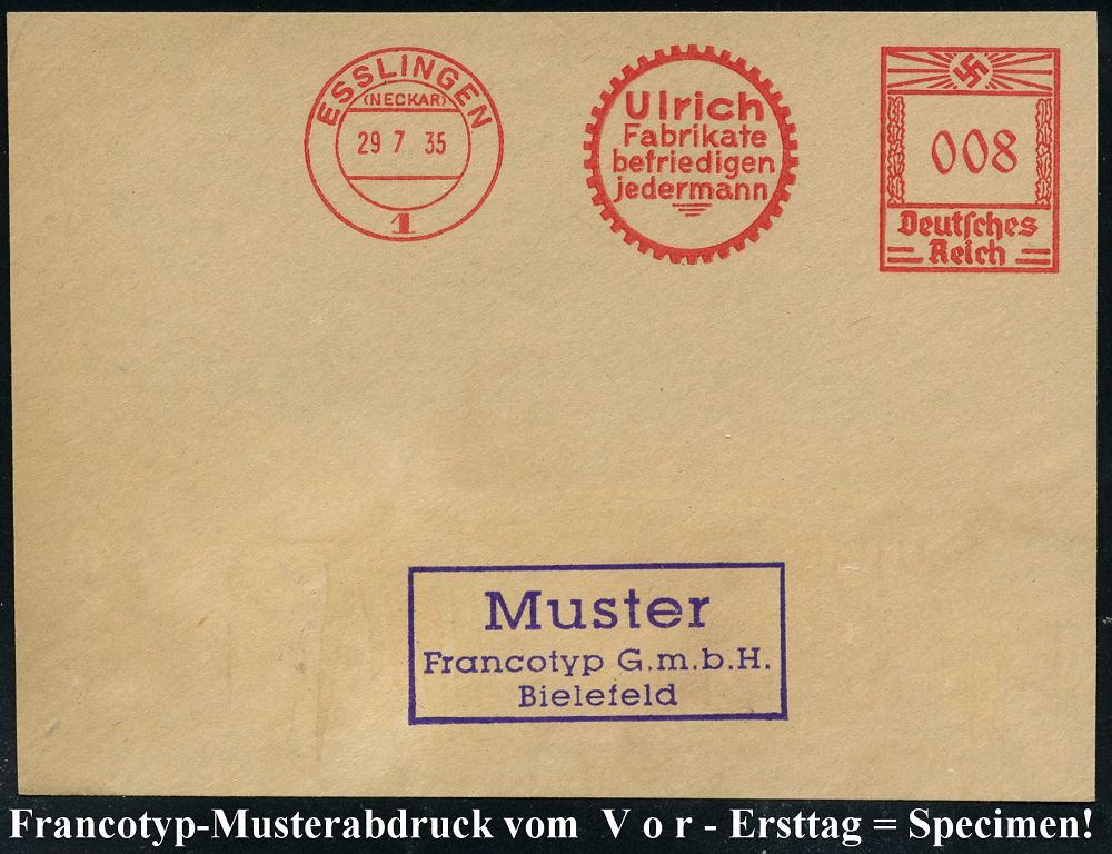 4432 | 35 € | 7300 ESSLINGEN : ESSLINGEN/ (Neckar)/ 1/ Ulrich/ Fabrikate.. 1935 (29.7.) AFS-Musterabdruck Francotyp "Hakenkreuz" (Zahnkranz-Logo) glasklar gest. Francotyp-Musterblatt vom V o r - Ersttag! (mit Attest), selten! (Dü.E-3CEo) | ![]() ![]() | |