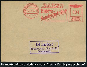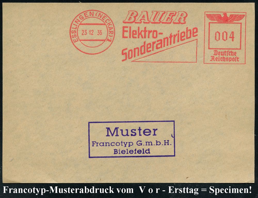 4435 | 35 € | 7300 ESSLINGEN : ESSLINGEN (NECKAR) 1/ BAUER/ Elektro-/ Sonderantriebe 1936 (23.12.) AFS-Musterabdruck Francotyp "Reichsadler" , glasklar gest. Francotyp-Musterblatt vom V o r - Ersttag!, (mit Attest), selten! (Dü.E-5CGo) | ![]() ![]() | |